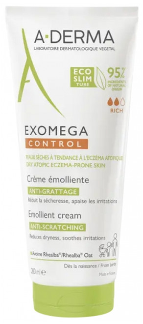 A-DERMA Exomega Control Anti-Itching Emollient Cream Eco-Slim Tube 200ml is a cream with rich texture indicated for the dry skin prone to atopic eczema of the whole family.