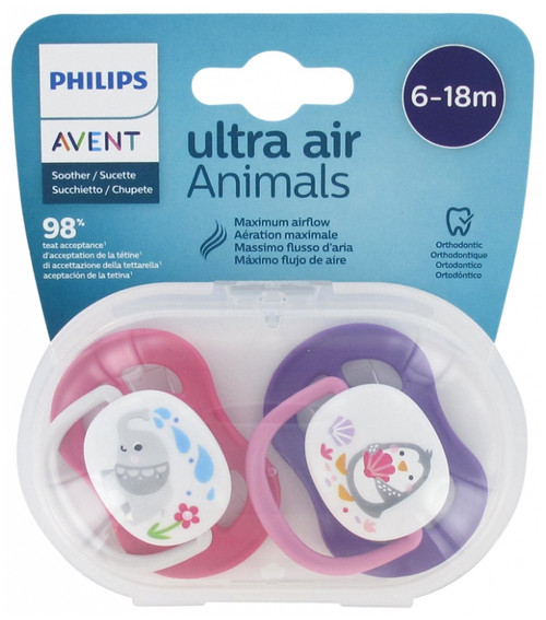 Avent Ultra Air Animals 2 Orthodontic Silicone Soothers 6-18 Months - Model: Elephant/Pinguin Red and Purple is a set of two orthodontic soothers with wide vents promoting maximum air circulation for sensitive skin.