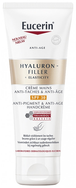 Eucerin Hyaluron-Filler + Elasticity Anti-Dark Spots & Anti-Aging Hand Cream SPF30 75ml is an anti-dark spot and anti-aging hand cream. It contains patented Thiamidol which visibly reduces the appearance of age-related dark spots and prevents their reappearance with regular use.