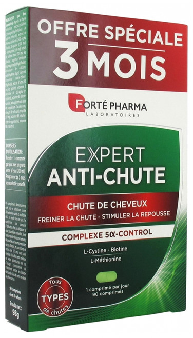 Forté Pharma Anti-Hair Loss Expert 90 Tablets is a food supplement specifically developed to target the causes responsible for hair loss (hormonal origin, hereditary, due to stress). Its highly dosed formula works in two steps to help: