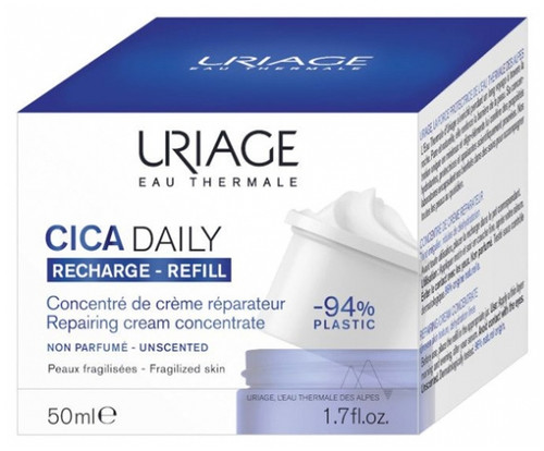 Uriage Cica-Daily Eco-Recharge Repair Cream Concentrate 50 ml is a treatment for fragile skin with uneven tone and fine dehydration lines. This ultra-comfortable, antioxidant cream concentrate strengthens the skin's defenses, repairs and regenerates the cutaneous barrier for soothed skin, a refined texture and a healthy glow.