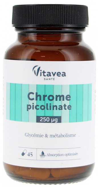 Vitavea Chrome Picolinate 250 µg 45 Capsules is a dietary supplement that helps regulate blood sugar levels and promote a balanced metabolism of carbohydrates, proteins and lipids.
